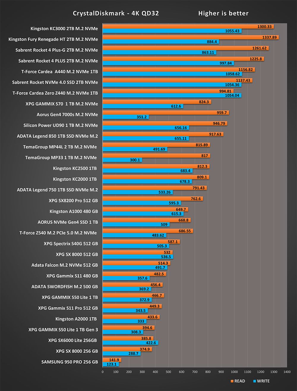 تستخدم اختبارات 4K QD 32 أحجام ملفات 4KB ، والوصول إليها في قائمة انتظار بعمق 32. يمكن لجهاز الكمبيوتر الخاص بك القيام بالكثير من الأشياء في عجلة من أمره ، ولكن لا يمكن القيام ب 32 شىئ في نفس الوقت بالضبط ، لذلك يستخدم قوائم الانتظار والمخازن المؤقتة لتتبع الطلبات التي لا تزال تحتاج إلى مكان. تأخذ كل من هذه الطلبات المدرجة في قائمة الانتظار جزءًا صغيرًا للغاية من الثانية حتى تكتمل حتى تتمكن من إجراء العديد من العمليات في ثانية من الزمن ، وبالتالي عمليات (I / O) (I / O في الثانية). إذا تمكنت من إجراء عملية كتابة في غضون 0.10 ثانية ، فيمكنك أن تقول إنك تستطيع تنفيذ 10 ك لكتابة عشوائية.