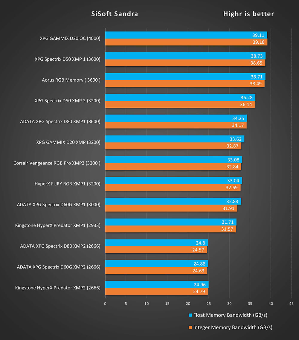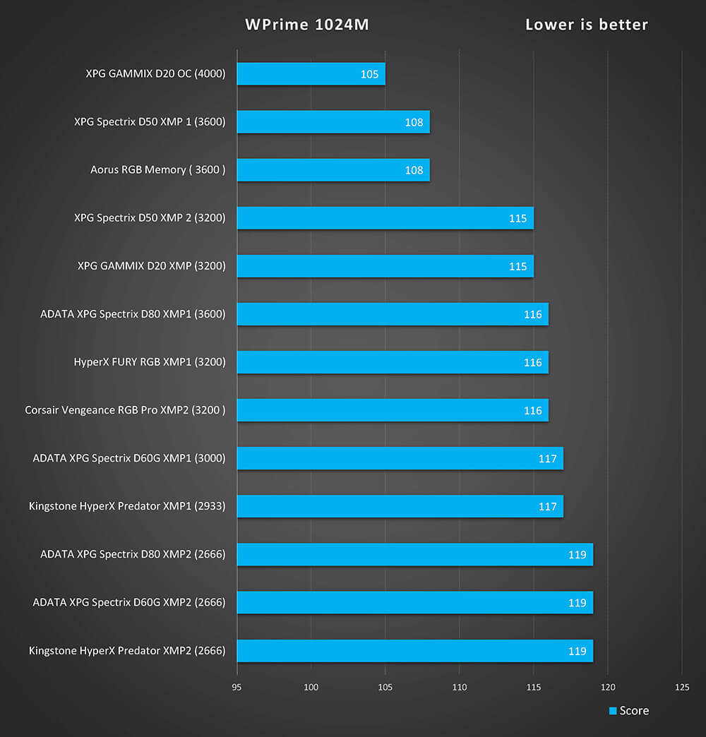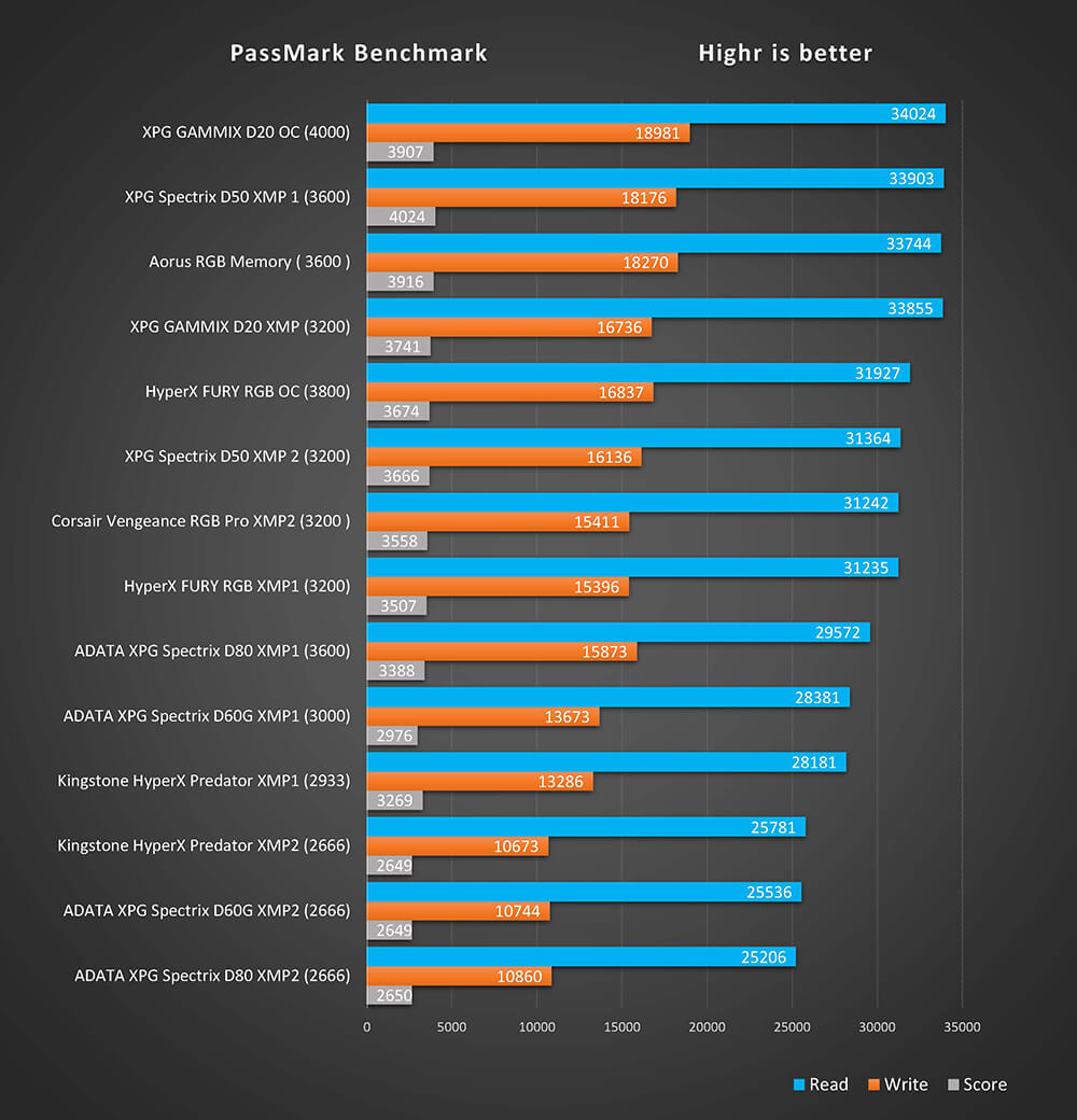 اختبرت الرامات XPG GAMMIX D20 مع تفعيل ملف 1 XMP على تردد 3200 MHz و ايضا مع كسر السرعة الى تردد 4000 MHz و هذا أفضل تردد يمكن الوصول اليه بسبب استخدام شرائح Hynix و ليست Micron أو Samsung لكن الوصول الى هذا التردد مع الحفاظ على التوقيتات منخفضة يعتبر نقطة ايجابية و يمكن الوصول الى ترددات أعلى من ذلك لكن متحكم الذاكرة فى المعالج يلعب دور فى هذه العملية لذلك كان تردد 4000 هو أفضل تردد تم الوصول اليه
