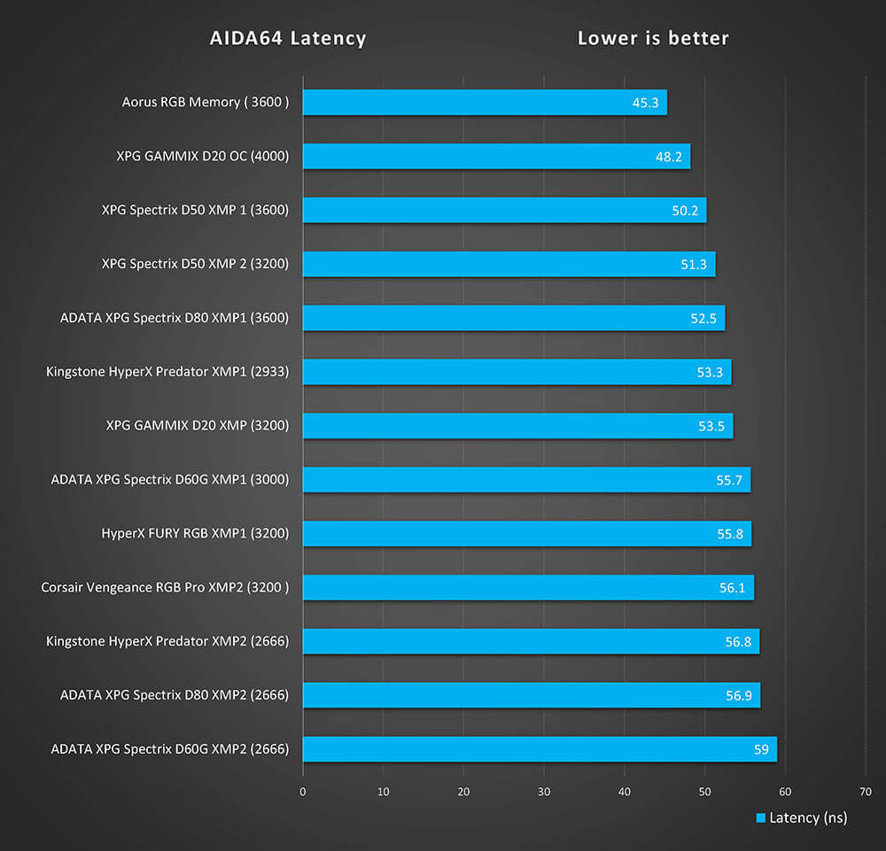 هناك قاعدة ثابتة تقول ان شرائح الذاكرة التى تأتى بتردد مرتفع لا تتمتع بوقت استجابة منخفض لكن قد سجلت XPG GAMMIX D20 مع التردد الاساسى 45.3 مللى ثانية لكن مع كسر السرعة مع ثبات التوقيت نرى 53 و هو زمن استجابة جيد