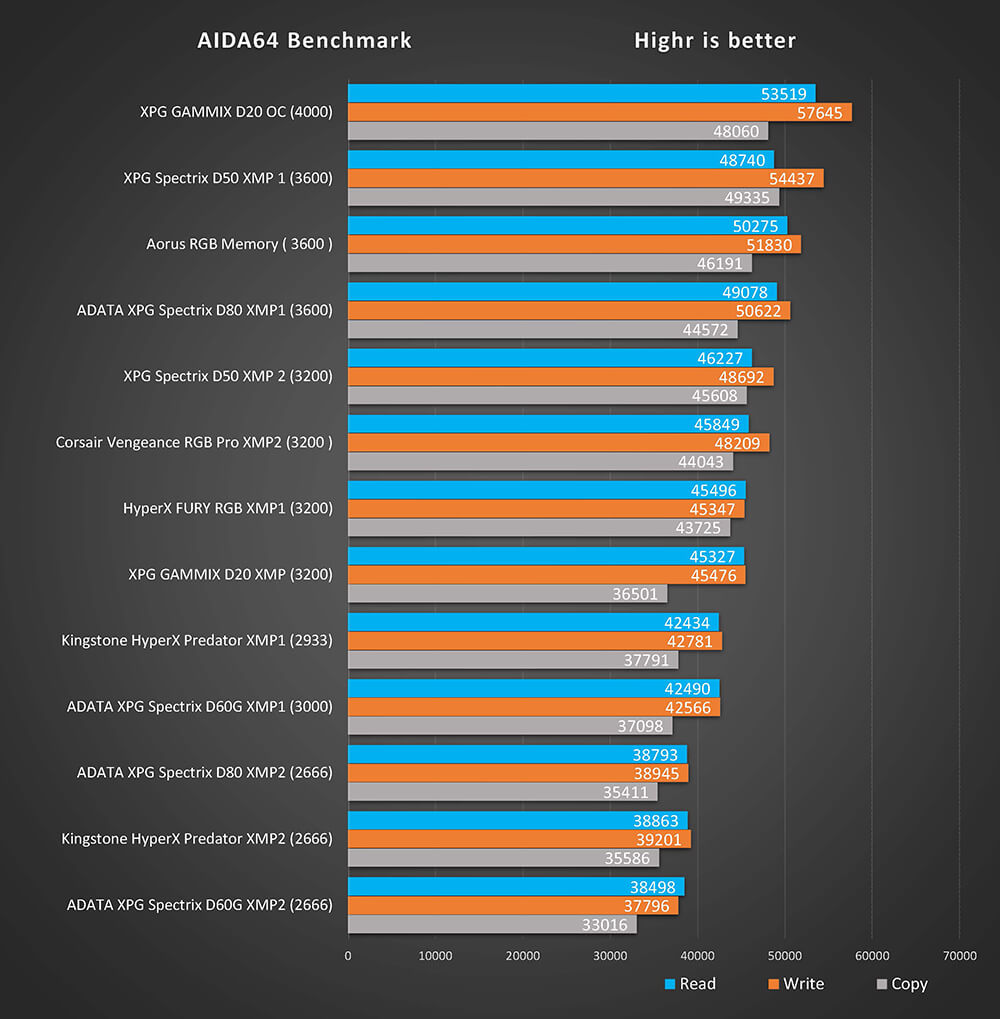 لأداء مع AIDA كان ممتاز مع سرعة قراءة وكتابة ونسخ جيدة عند استخدام تردد 3200 MHz مع تفعيل خيار XMP . ومع ذلك ، فمن الواضح أن فارق الاداء مع رفع تردد التشغيل كان كبير نسبيا و الاهم لدينا هنا هو التردد الاساسى للذاكرة الذى يقدم اداء ممتاز جدا